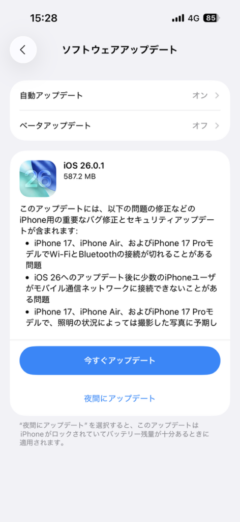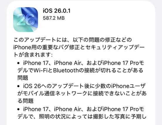 iOS 26.0.1は「新しいおもちゃが増えるアップデート」ではなくて、「壊れていた部分を直してくれるアップデート」という印象になった。