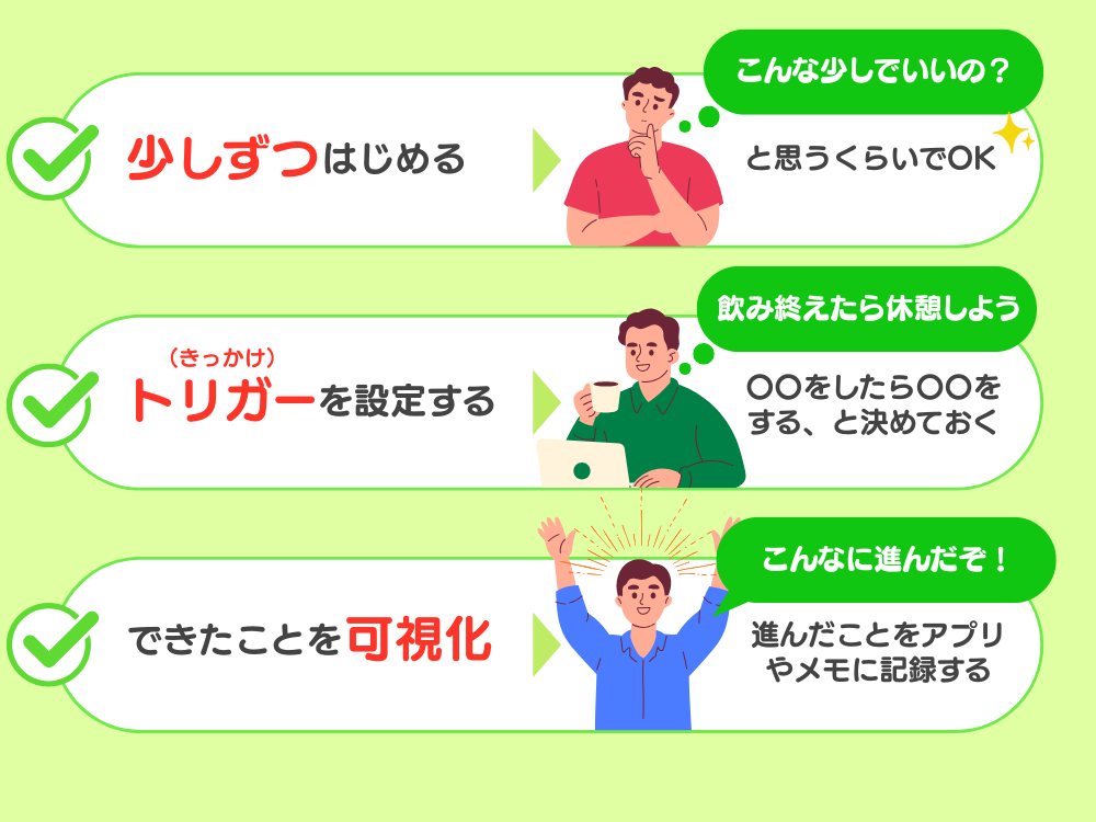 自分だけで悩まず、周囲に相談しながら少しずつ習慣をつけていきましょう!
