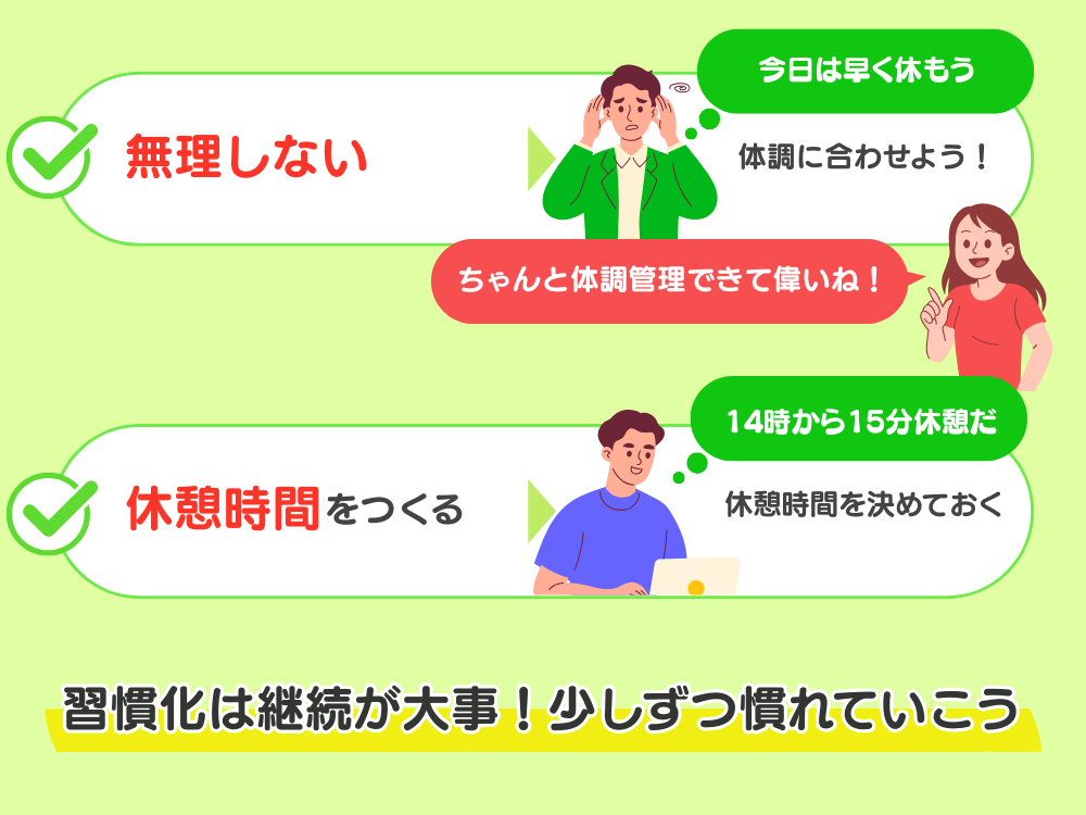 体調がすぐれない日は無理をせず、負荷を下げることも大切です。 - 休憩時間をつくる