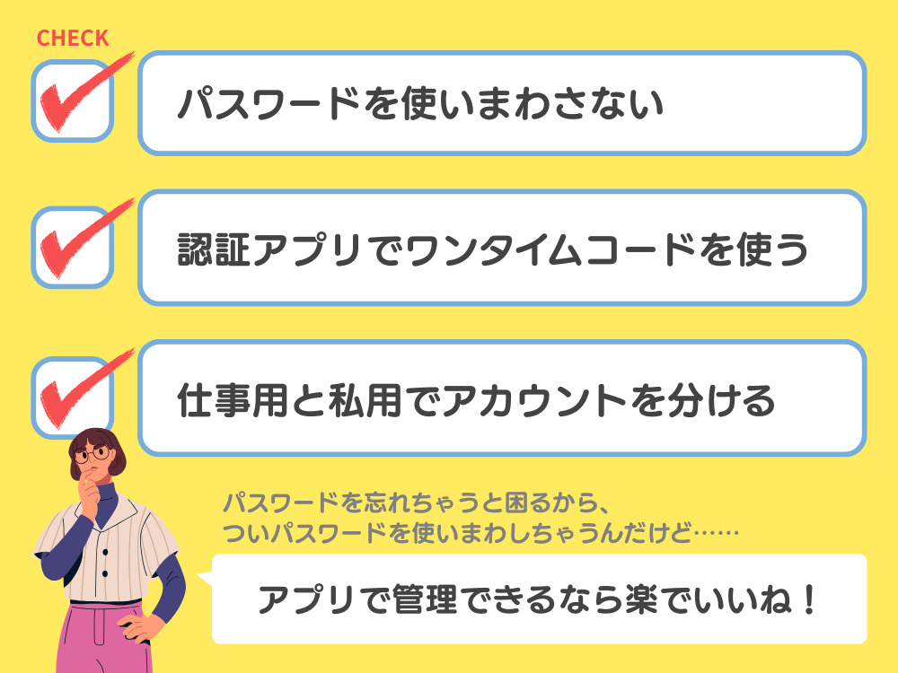 業務データは業務用アカウントで管理し、クラウドストレージやメールのアクセス権を最低限に絞る運用を行いましょう。