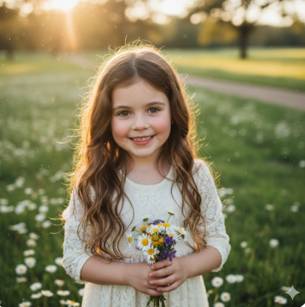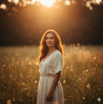 ✅ 「夕方の光の中で微笑む、落ち着いた雰囲気の女性」