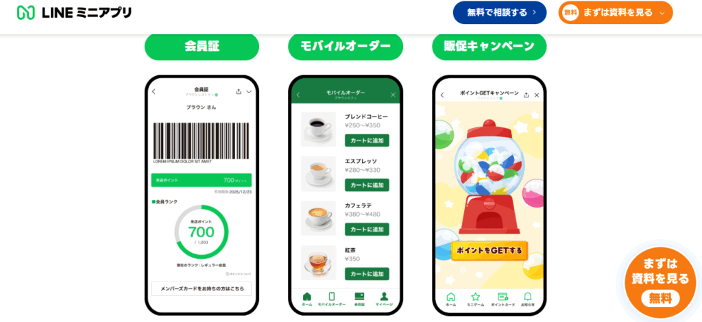 ミニアプリとは、店舗や企業が アプリをダウンロードせずに使えるサービス をLINE内で提供する仕組み。