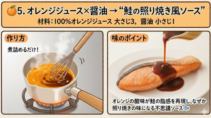 🍊5. オレンジジュース×醤油 → “鮭の照り焼き風ソース”