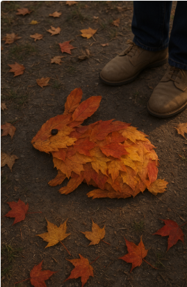 「公園に散った赤・黄色・茶色のカエデの落ち葉だけを使い、ウサギの形を作った落ち葉アート。自然光、影は左側に統一。落ち葉はランダムな重なりで配置。人の足を入れてリアルな感じにしてほしい。」