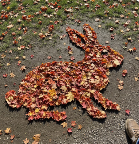 「茶色と黄色の落ち葉を使ったウサギの落ち葉アート。自然な陰影、地面は芝生。落ち葉はランダムで厚みあり。人の足が入ってリアルな感じにしてほしい。」