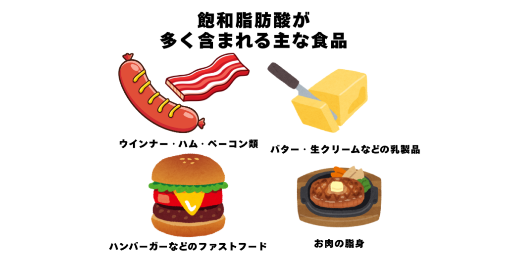 飽和脂肪酸は、乳製品や肉などの動物性脂肪や、パーム油などの植物性油に多く含まれています。