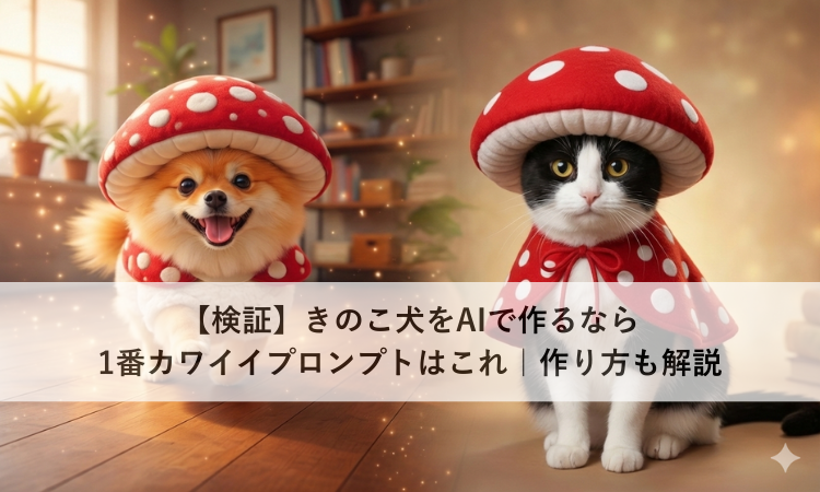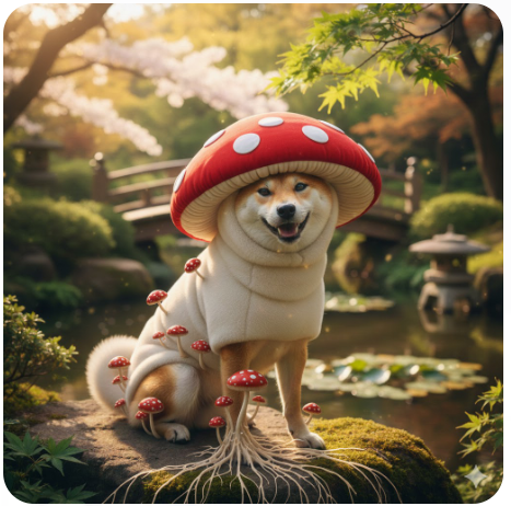 犬が、リアルな質感のきのこの衣装を着ている画像を作って