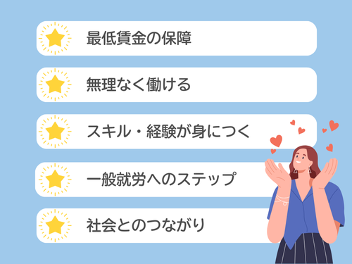 利用者は事業所と雇用契約を結ぶため、最低賃金が保障され、労働者としての立場で働くことができます。これはB型事業所との大きな違いでもあります。