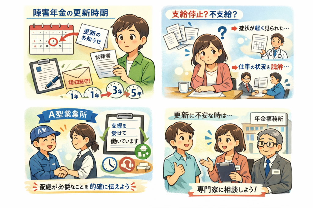 障害年金の更新時期とは?手続きの流れ・注意点・不支給を防ぐポイント解説障害年A型就労