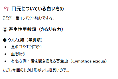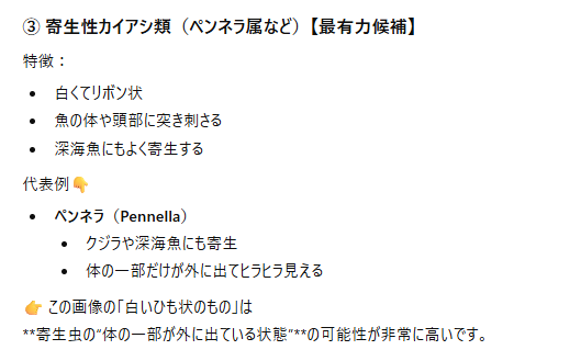 👆はイメージ画像ですが、深海魚寄生虫が引っ付いているのではないかとのことです🐟