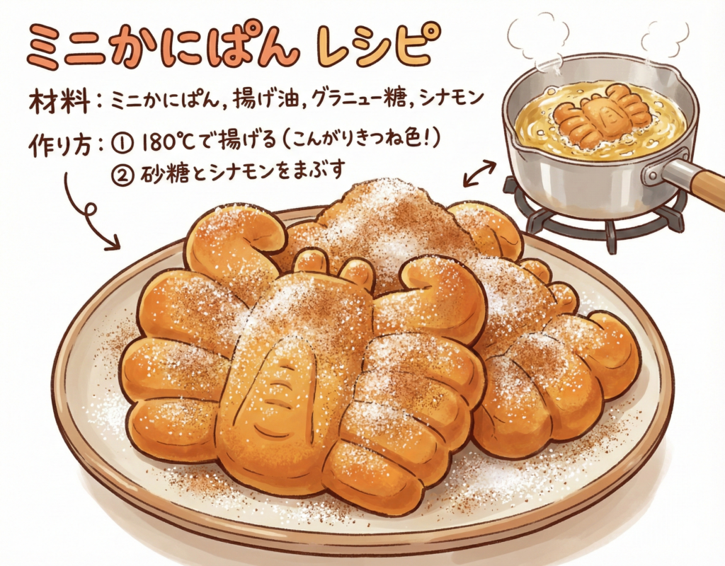 ① 高温(180℃)に熱した油で、ミニかにぱんを揚げる(※焦げやすいので注意!)。こんがりときつね色になったら取り出して余分な油をきる。