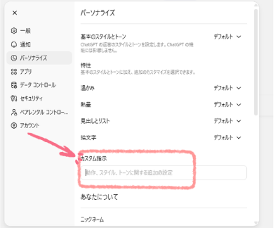 ③カスタム指示に先ほどのプログラムを入れる!