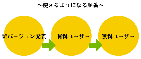 新しいバージョンが発表されても、まずは有料ユーザーなどから順番に公開されることが多く、無料ユーザーは少し遅れて使えるようになる場合があります😭