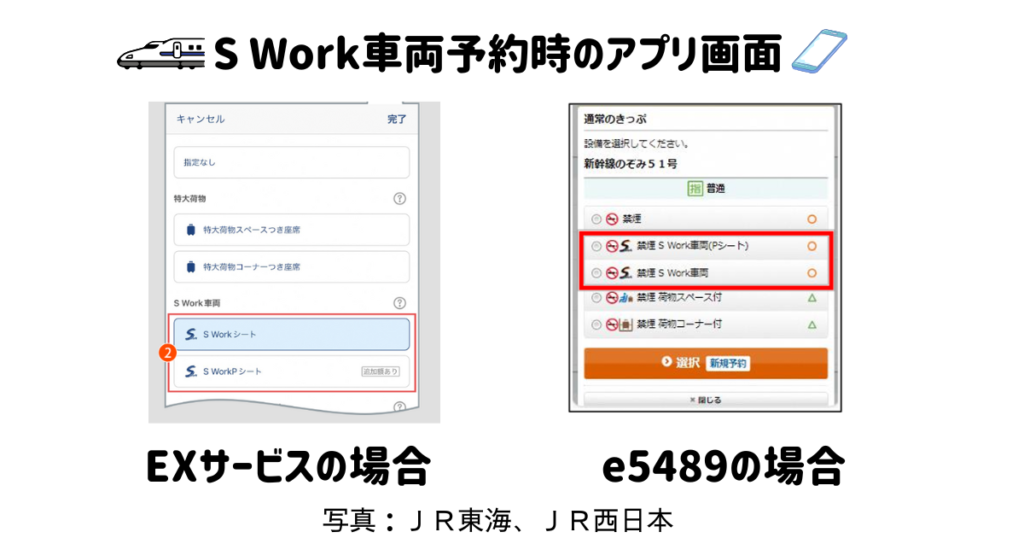 「エクスプレス予約」や「スマートEX」、「e5489」では、「席種」や「きっぷの種類」などの項目から、「S Work シート」や「S Work Pシート」を選択して予約します。