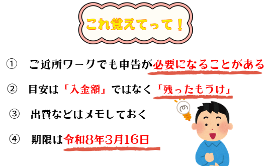 ご近所ワークで得たお金も、金額や状況によっては確定申告が必要です。