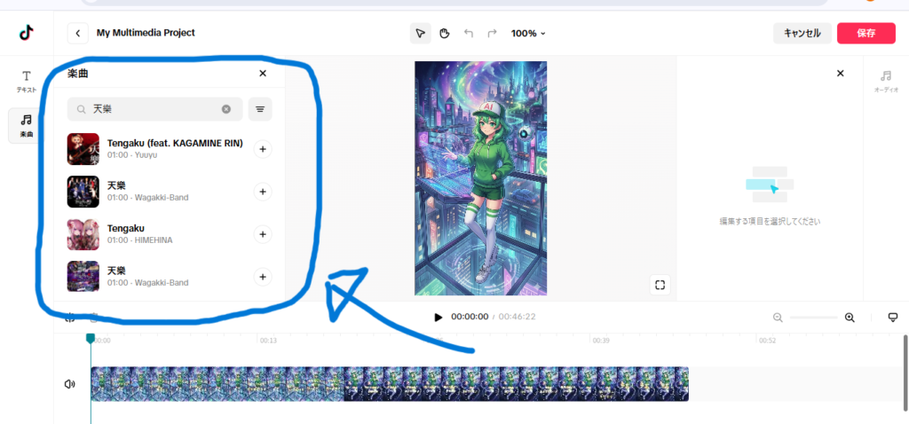 ここで楽曲が見つかっても安心するのはまだ早いです。一回楽曲を聞いておきましょう。イントロが長すぎて肝心な部分が入ってない時がそこそこあります。カバー等々だと収録している部分が違うこともあるので、いろいろ聞いてMVに合いそうな音源を探しましょう。