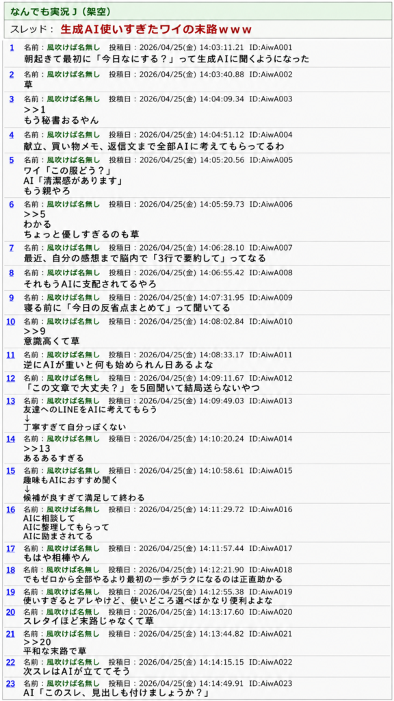 今回はそんな少し大げさな「生成AI依存あるある」を、なんJ風のスレっぽいノリで作ってみます🙌